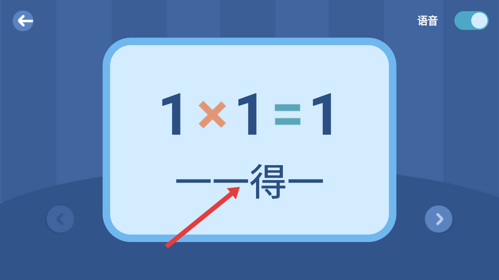 3、点击单个口诀,如【1×1=1-一一得一】,强化算式与口诀对应关系,借助语音功能辅助记忆。