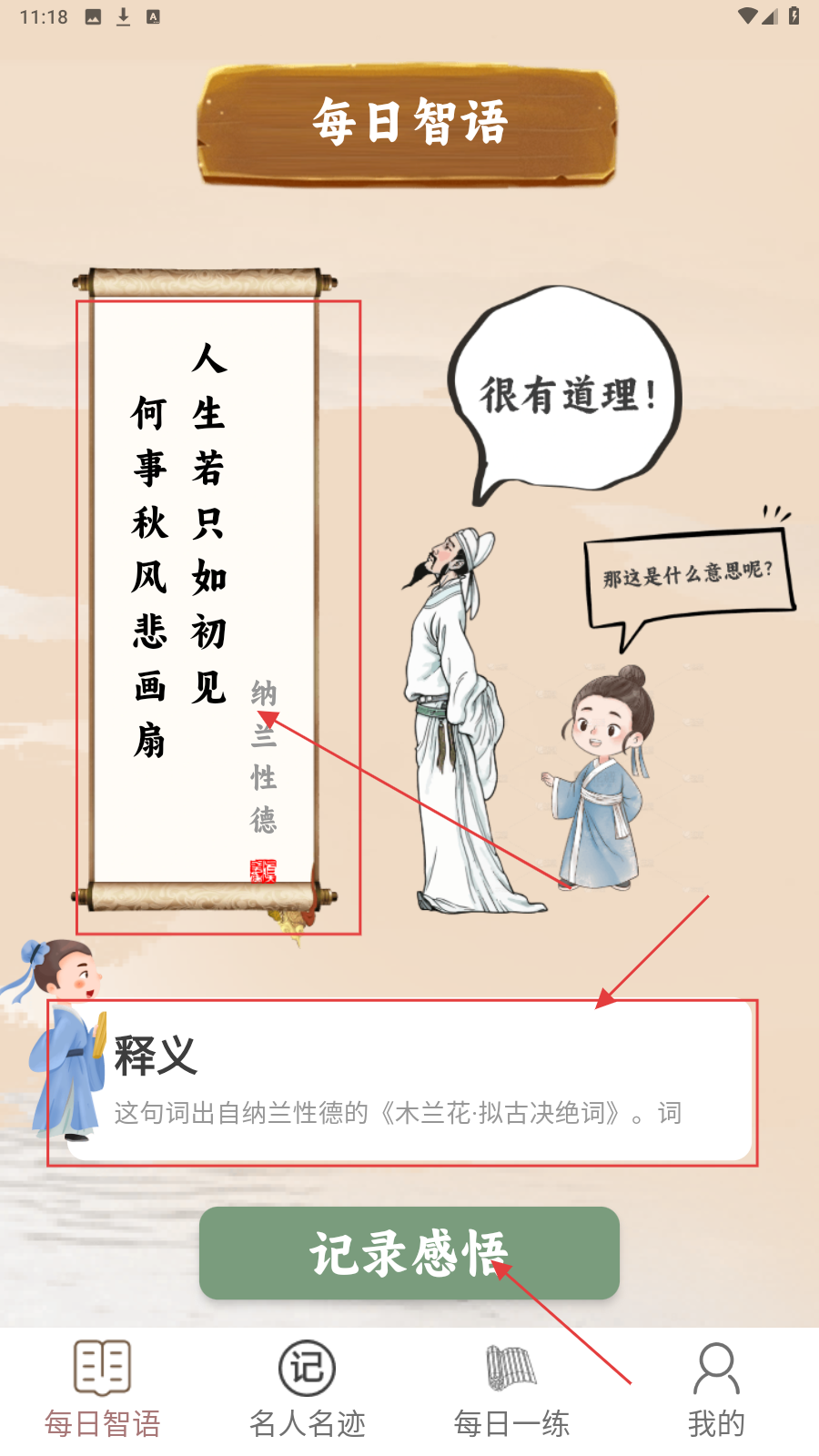 1、进入每日智语,读纳兰性德词句,看释义理解含义,点【记录感悟】写心得。