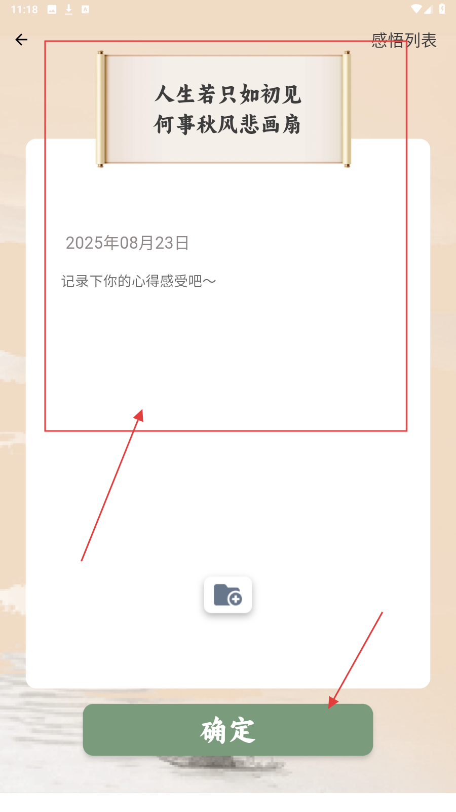 2、在记录感悟页,写下对词句的心得,填完点【确定】,保存感悟内容。