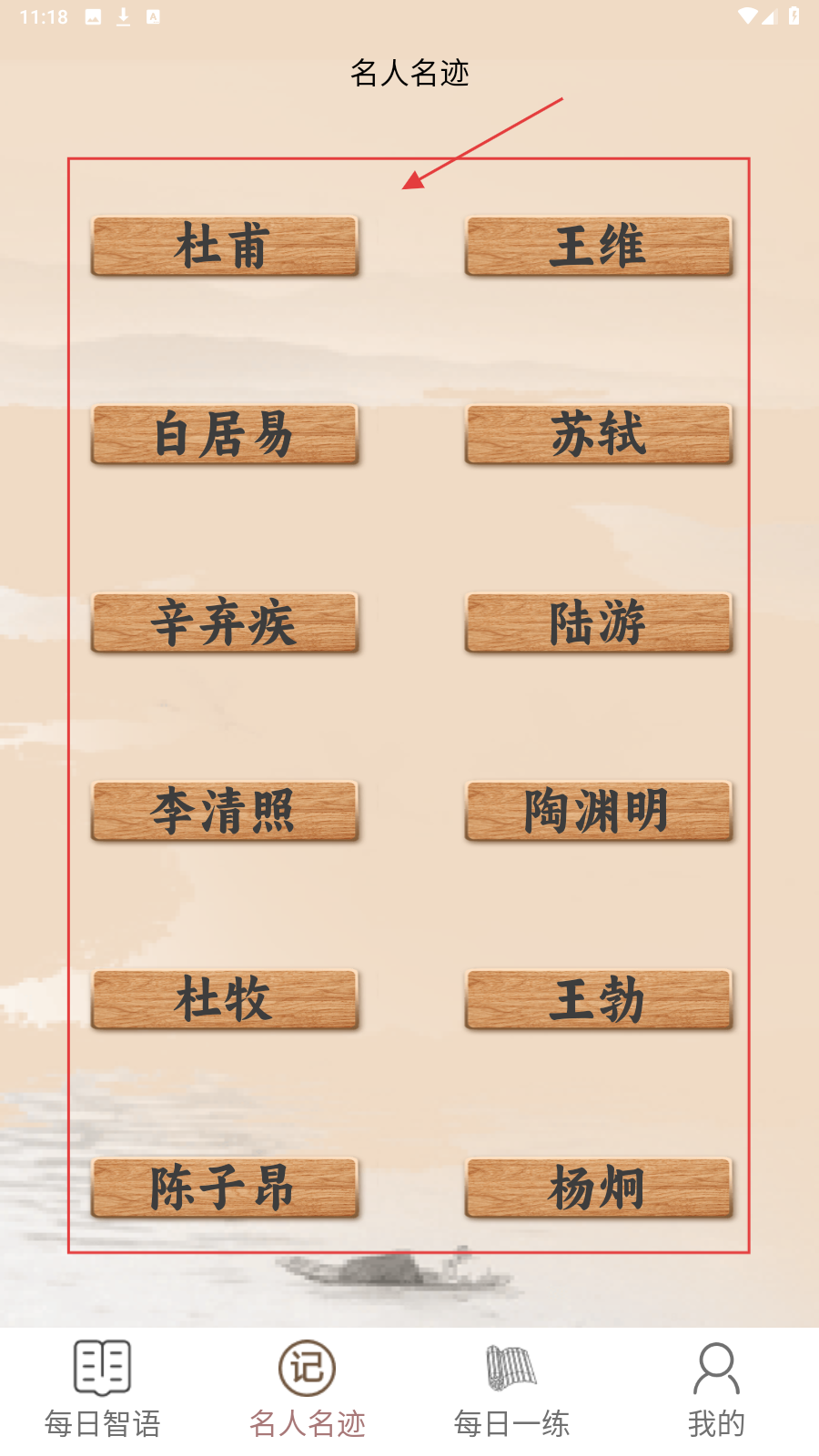 3、进入名人名迹,选择诗人(如【杜甫】【王维】等),点击查看对应名人的文学知识与事迹。
