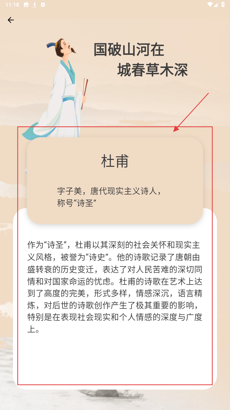 4、在杜甫详情页,阅读其简介及诗歌影响,学习文学贡献。