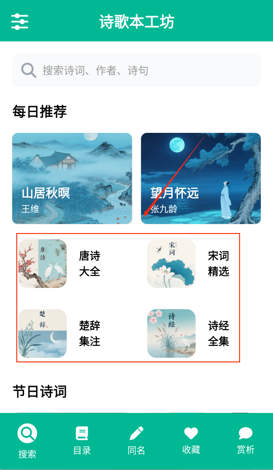 诗歌本工坊包含唐诗、宋词、楚辞、诗经等各类经典作品,支持分类检索和关键词搜索。其特色功能包括诗词赏析、收藏管理、同名诗词查询等,帮助用户深入理解诗词内涵。简洁的界面设计和系统的分类体系,让诗词学习更加便捷高效,这款应用能提供优质的诗词学习体验。