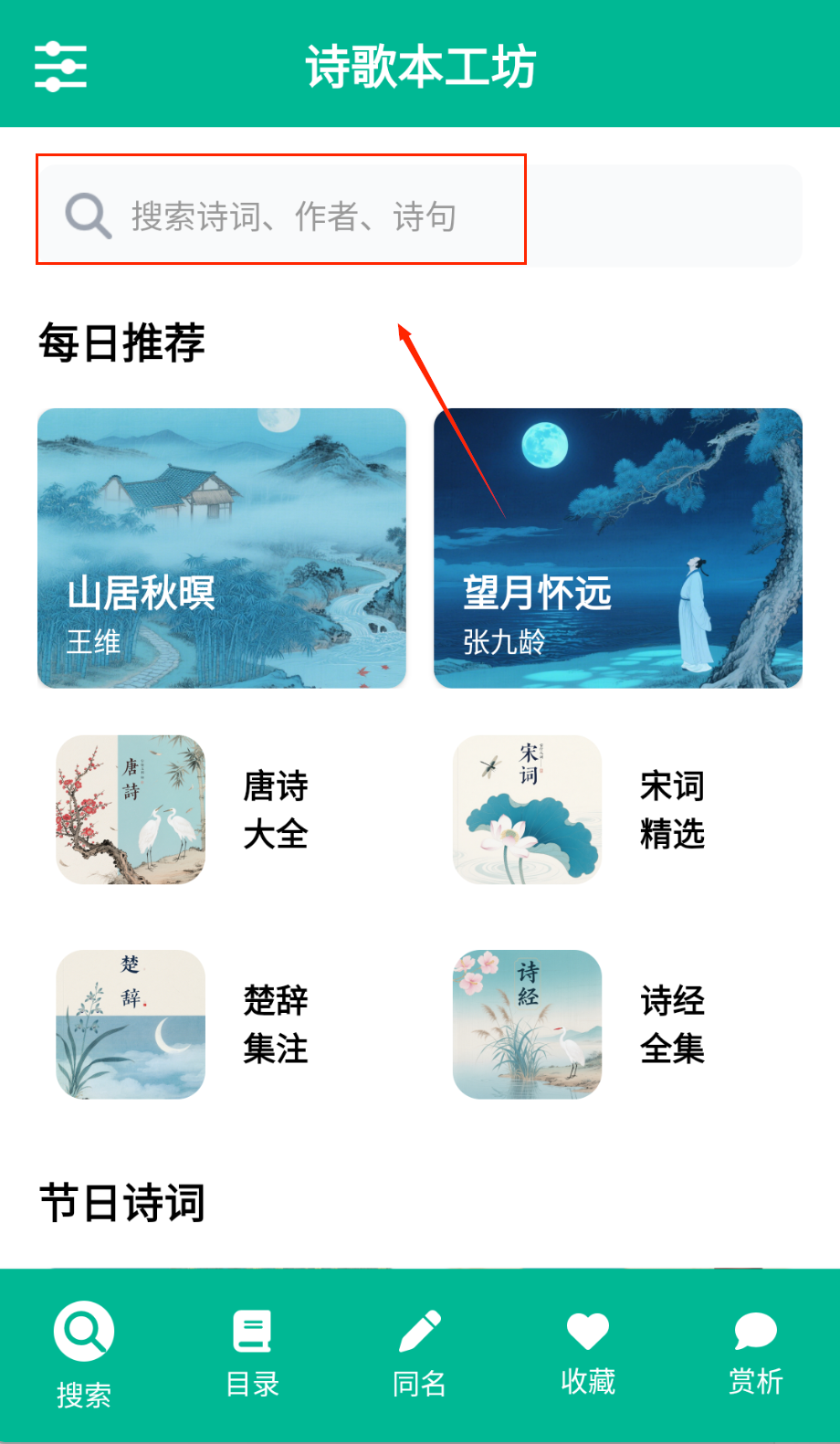 1、下载安装后浏览首页推荐诗词,了解软件基本功能。通过分类导航快速找到感兴趣的诗词类型,如唐诗或宋词。