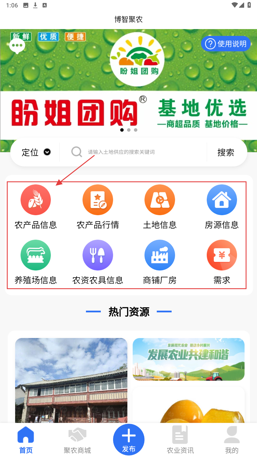 1、在【博智聚农】首页,选【农产品信息】,进入农产品资源列表,找所需农产品。