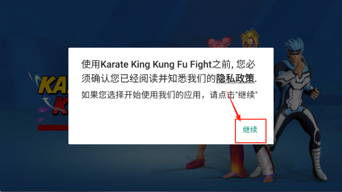 1、阅读隐私政策后点击“继续”,授权进入游戏主菜单。