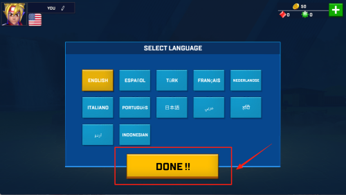 2、在“SELECT LANGUAGE”界面选择“ENGLISH”或其他语言,再点“DONE!!”保存。