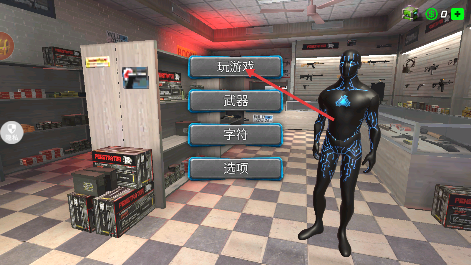 1、进入界面后,点击【玩游戏】开启冒险,后续可通过【武器】【字符】等功能强化角色。