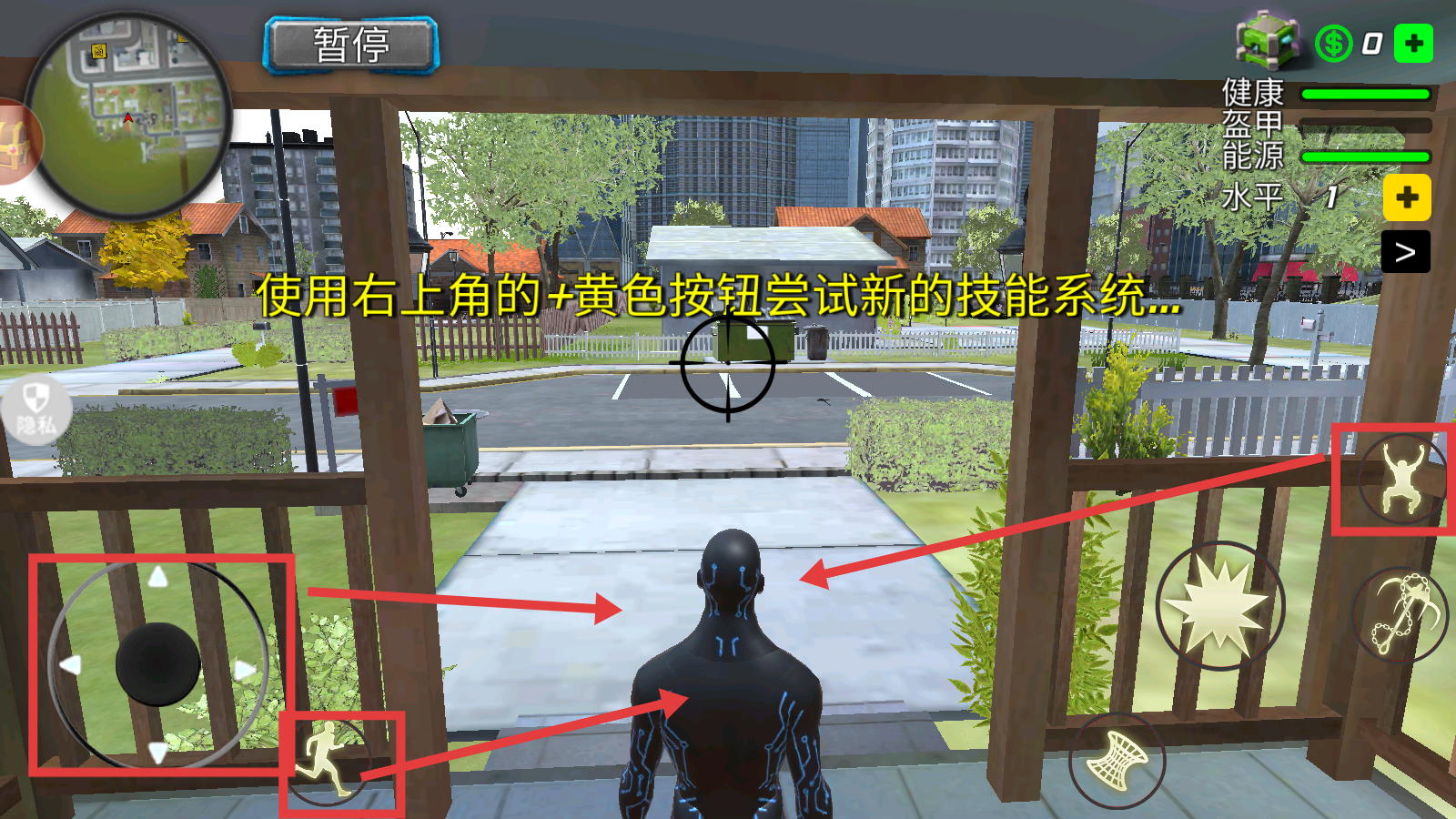 2、冒险中熟悉左侧【摇杆】控移动,搭配【奔跑】【跳跃】键,点右上角【+】探索技能系统。