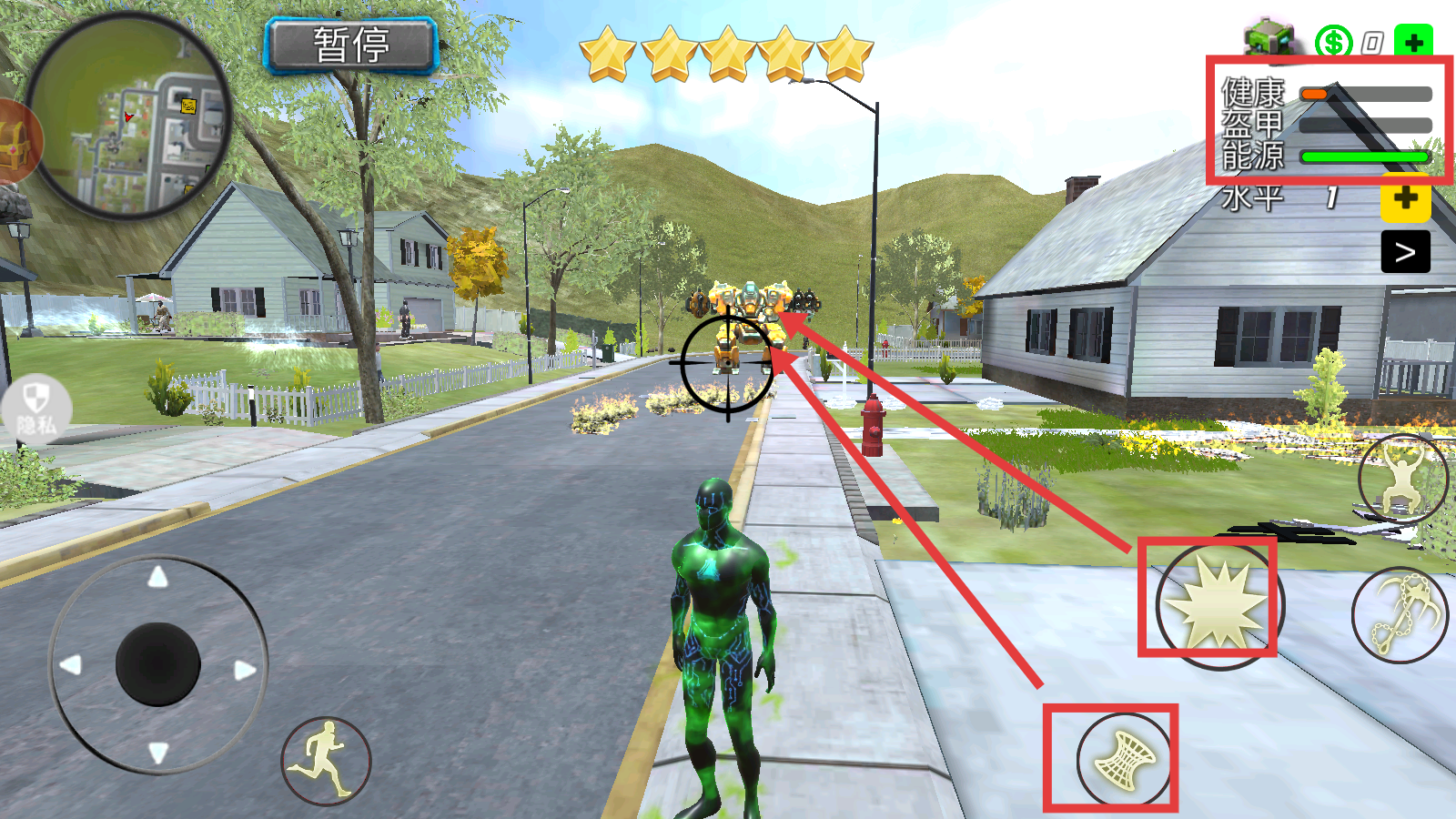 3、战斗时关注【健康-盔甲-能源】状态,活用右侧技能,精准打击前方机甲敌人。