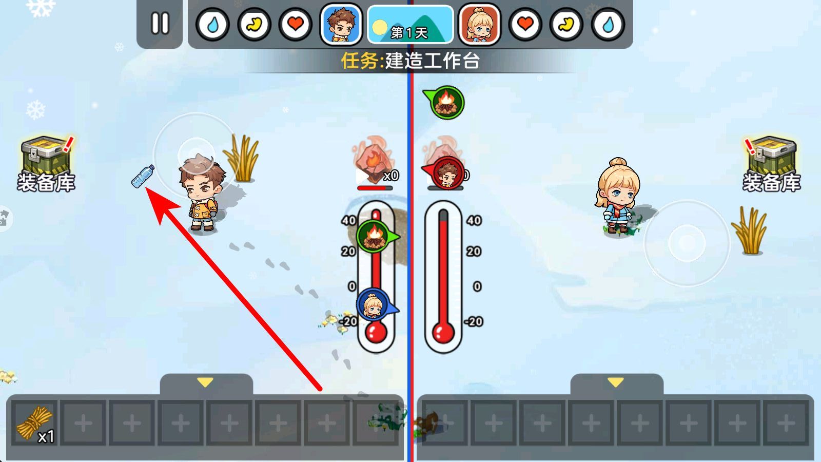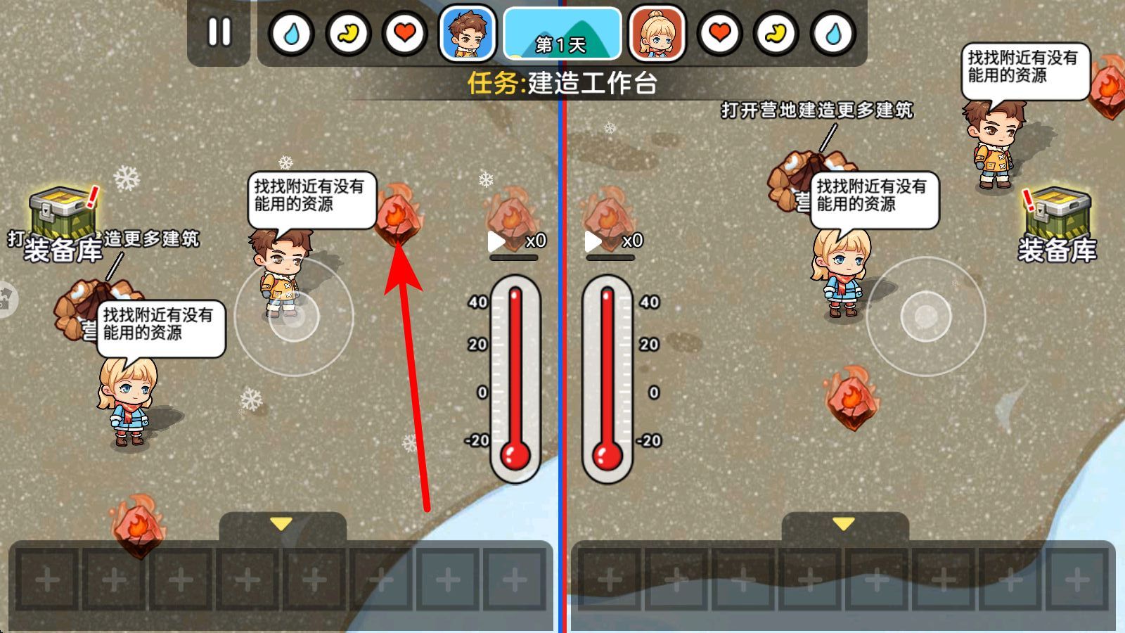 1、首日任务为建造工作台,搜索场景内红色火焰状资源燃料与装备库周边区域,两人分工标记资源点位,确保燃料、基础物资覆盖,为建造储备核心素材。
