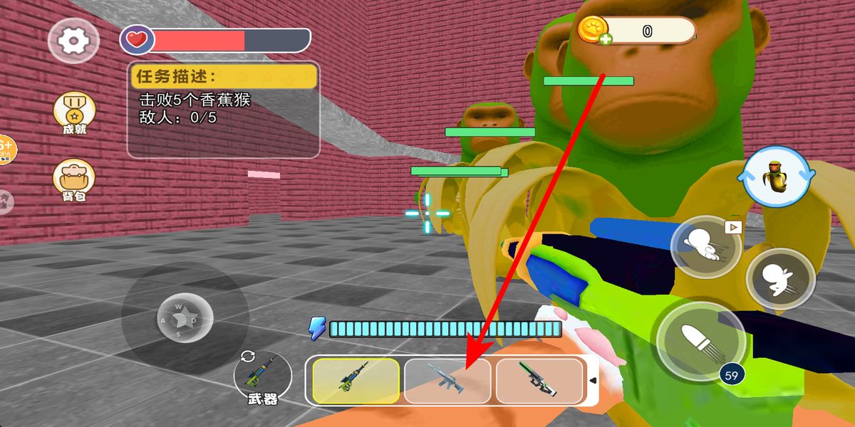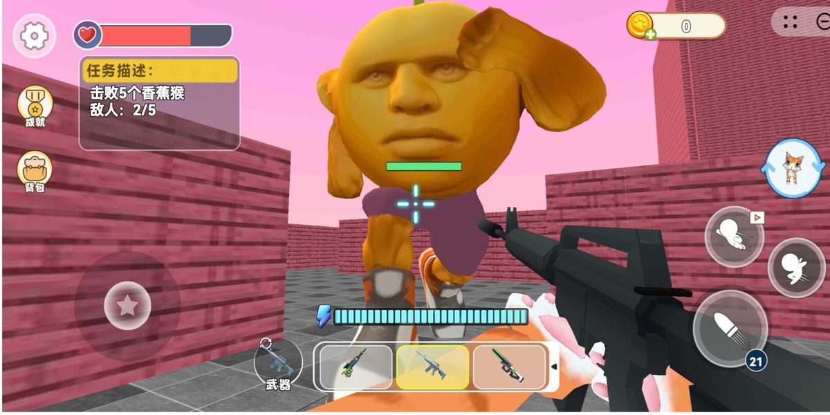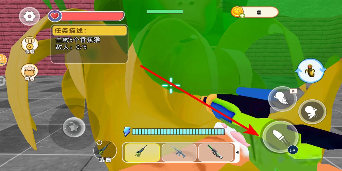 2、战斗射击操作接取击败香蕉猴等任务后,瞄准目标点击右侧射击按钮,消耗弹药攻击敌人,观察血量与任务进度,灵活调整战斗策略。