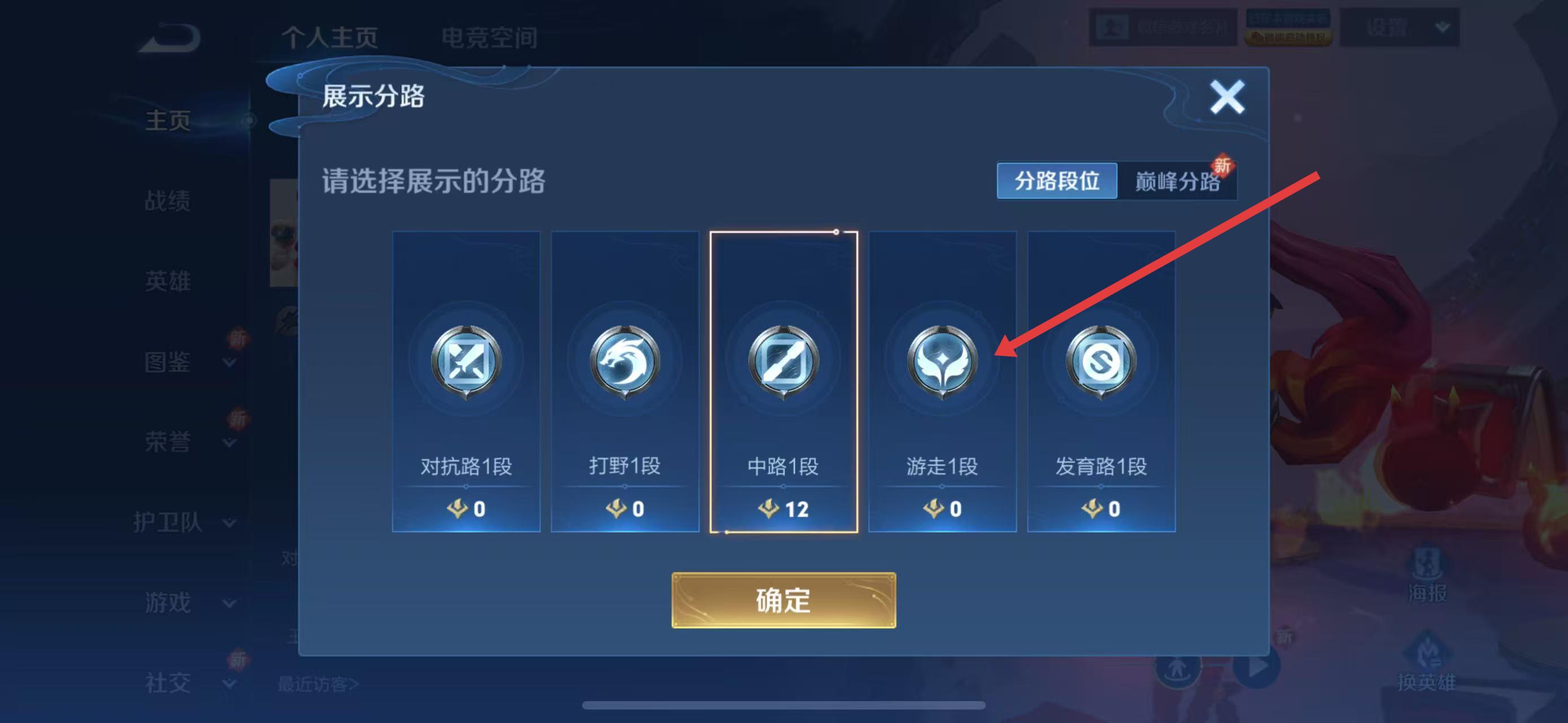 3、在展示分路设置界面中,选择想要展示的分路,比如游走1段等,点击确定,即可完成分路修改与展示设置。