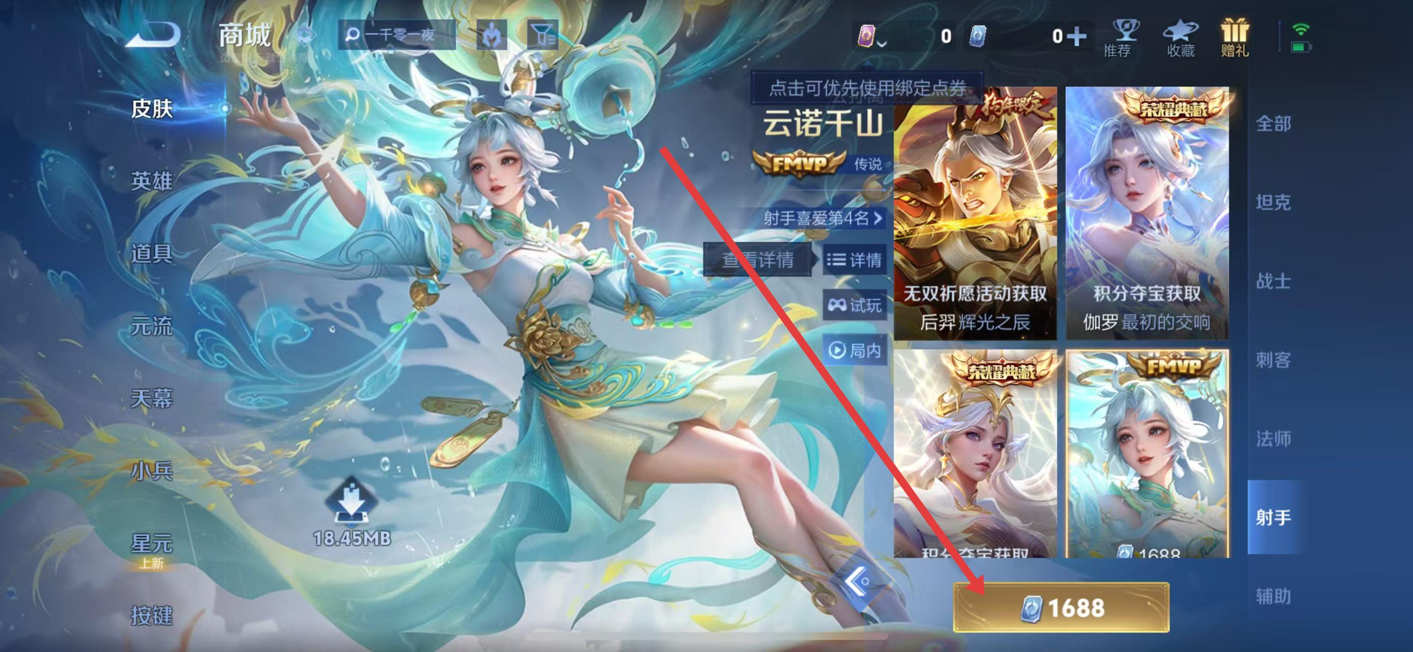 2、在商城页面中,点击皮肤选项,浏览各种英雄皮肤,找到想要购买的皮肤并点击进入详情页。
