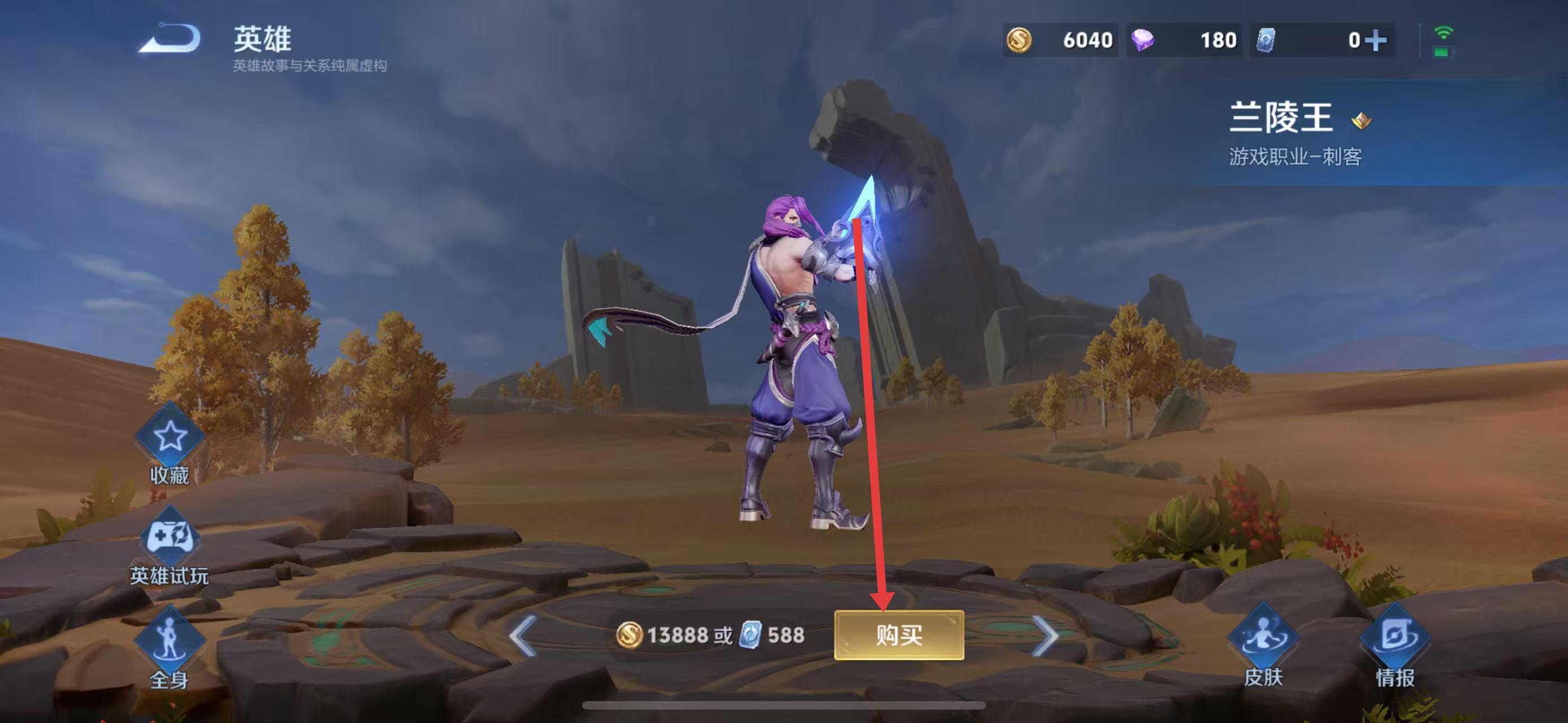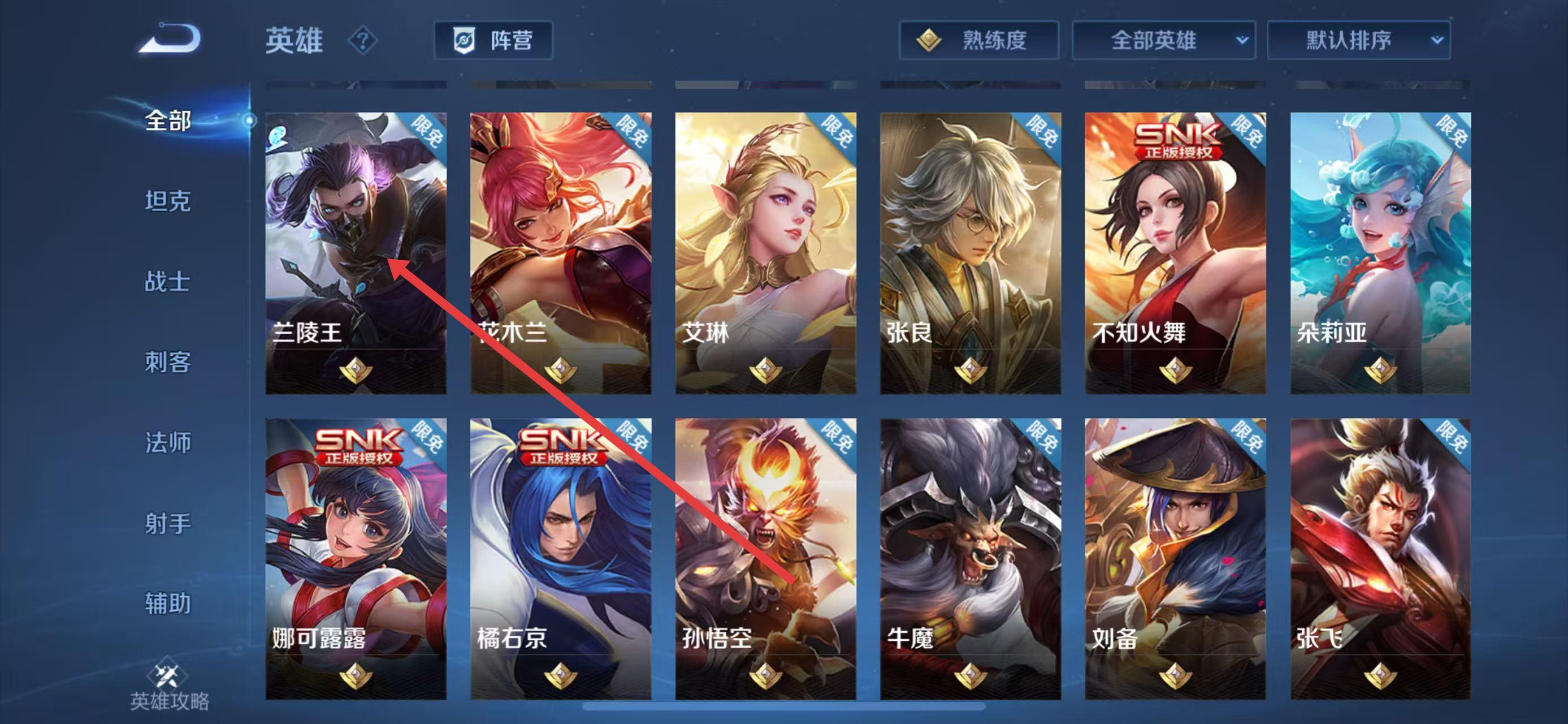 2、在英雄界面,找到并点击想要购买的英雄如兰陵王,进入英雄详情界面。