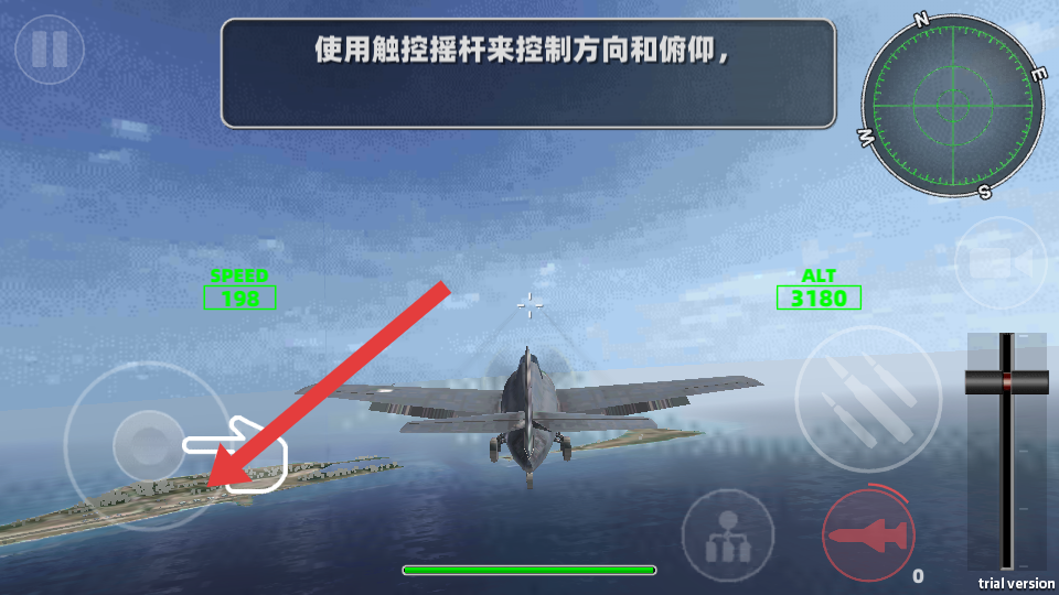 1、摇杆控制:拖动左侧触控摇杆,可调整战机的飞行方向左右与俯仰上下,进而改变飞行姿态。