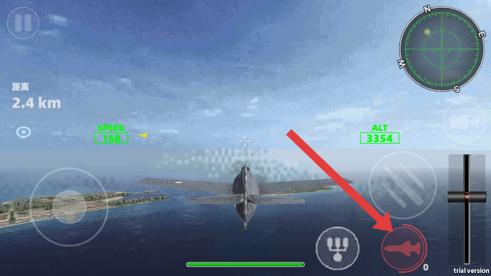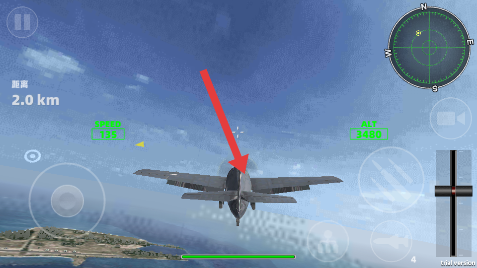 3、目标追踪:雷达罗盘呈现目标位置,距离从2.4km缩短至2.0km,调整摇杆使战机朝目标方向飞行。