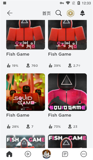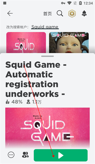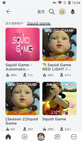 2、Squid game模式如何进入?依旧是从首页中通过放大镜图标那里点击进行搜索,通过输入"Squid game"就能快速的获取所有该游戏下所有该模式相关的房间;