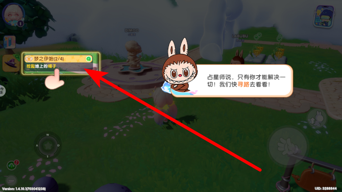 1、进入游戏后接任务后,界面左侧弹出捡起地上的帽子指引,跟随箭头找发光区域,点击互动拾取帽子,推动任务进度至二阶段。