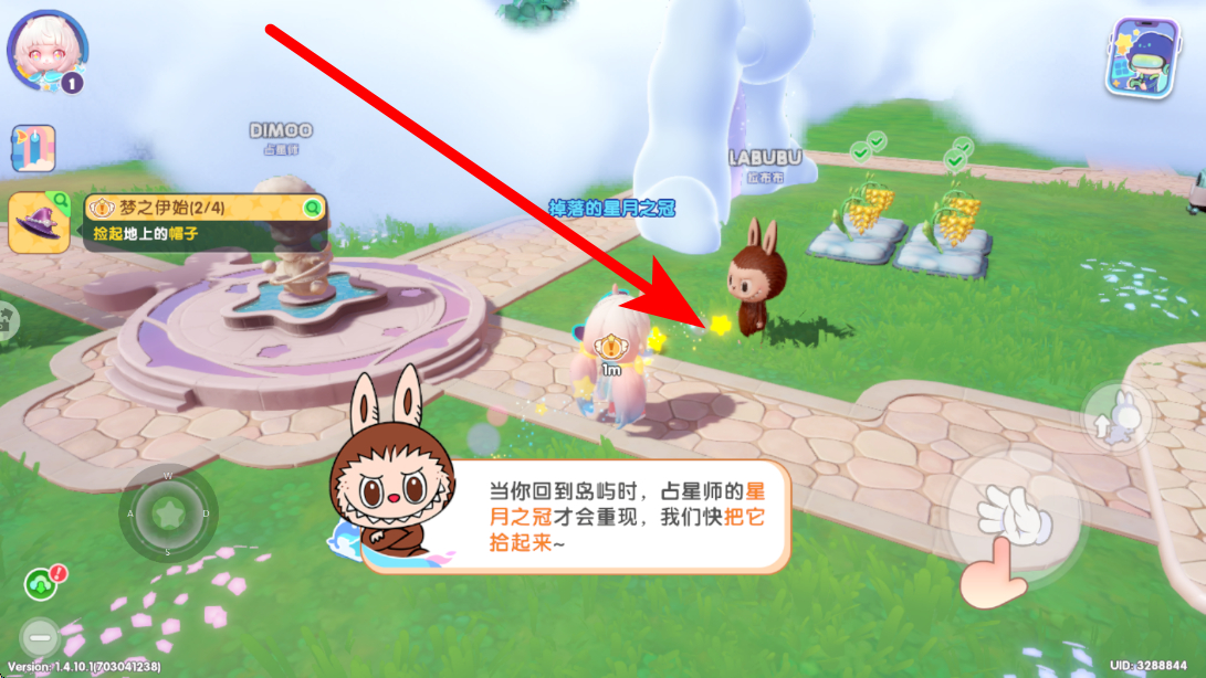 2、移动捡完帽子后,前往新指的引点,观察发现掉落的星月之冠,靠近黄色光点,点击拾取该道具,解锁占星师相关剧情线索。