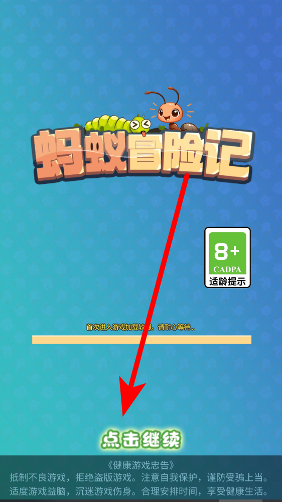 1、开局引导进入游戏点击点击继续,跟随提示熟悉界面,蚂蚁世界初始等级为1,屏幕中央箭头标记可挖掘区域,点击土块即可启动蚁穴拓展,掌握基础操作逻辑。
