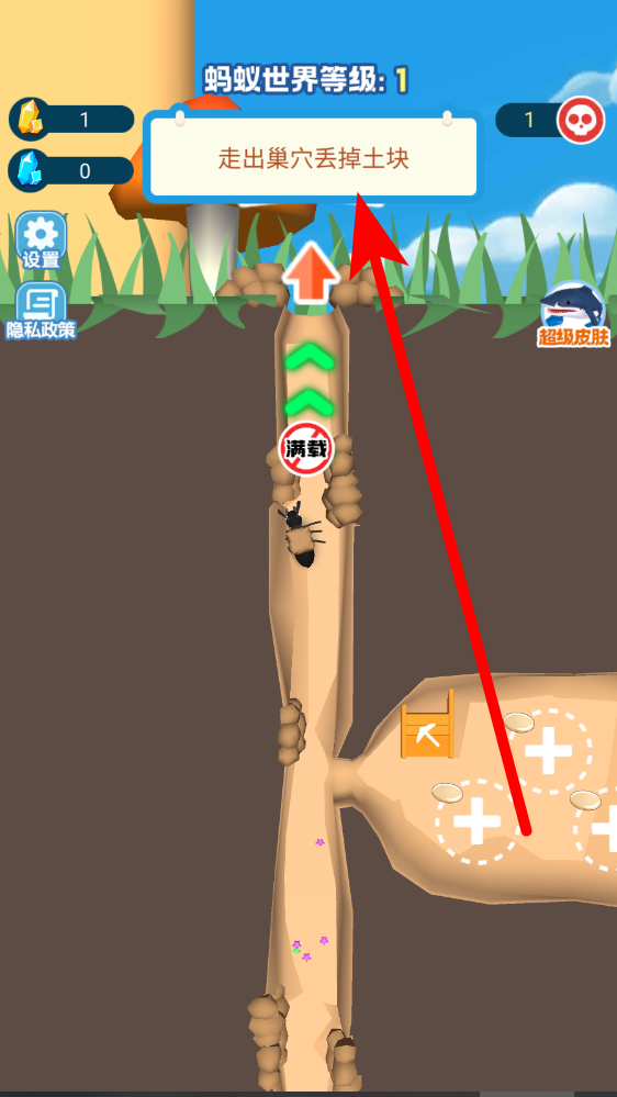 3、运土流程当蚂蚁满载土块,跟随向上箭头指引前往巢穴出口,将土块丢弃至地面,完成运输后返回蚁道继续挖掘,通过反复运土扩大蚁穴空间,推动蚁群成长。
