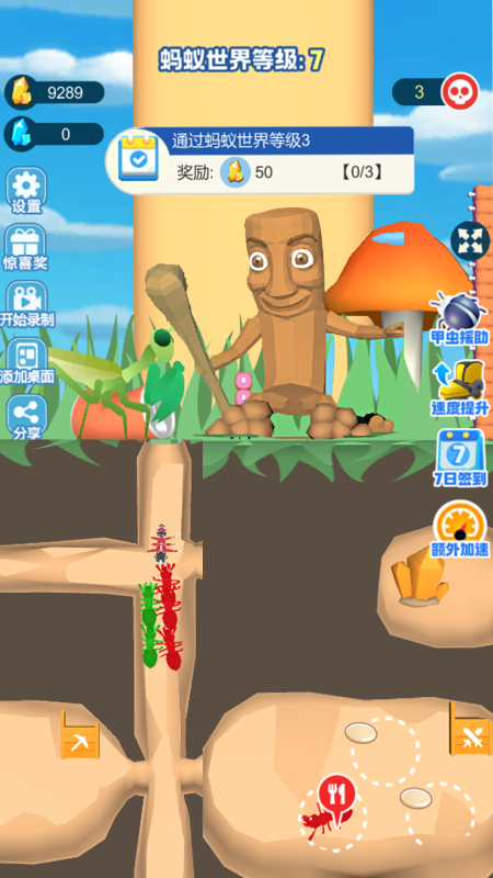 2、培养分工管理:孵化不同工种蚂蚁,提升其等级与能力,指派工蚁采集资源、兵蚁巡逻防御、繁殖蚁开拓领地,通过分工协作实现蚁群高效运转。