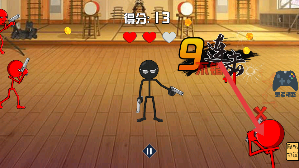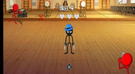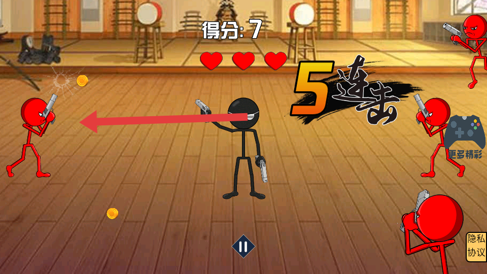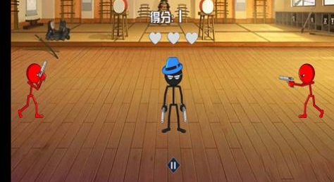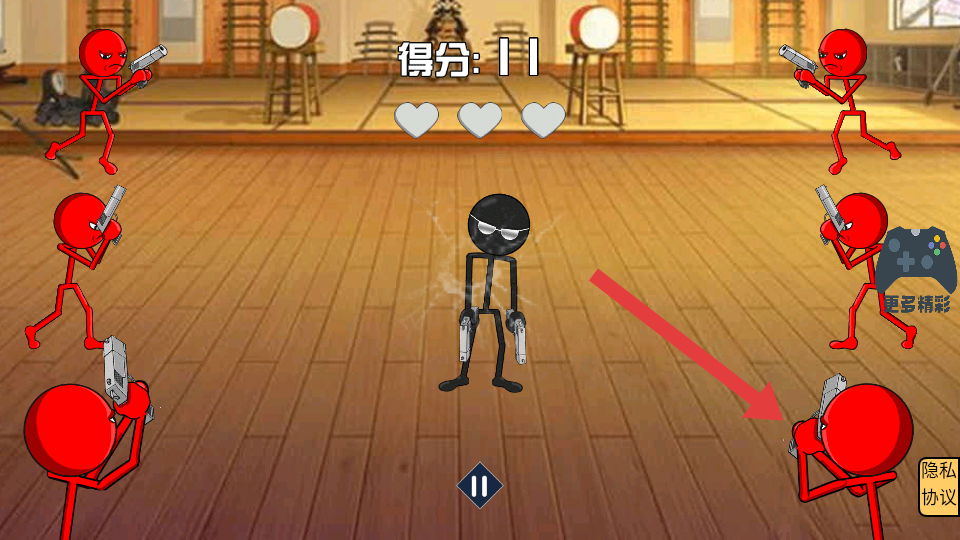 1、进入游戏,操控黑色火柴人,面对四周红色持枪敌人,快速瞄准射击,利用优势,优先攻击近身敌人,守护初始爱心。