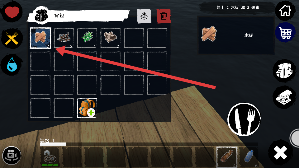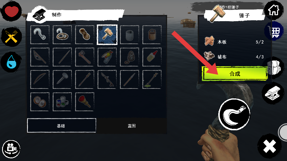 1、物资收集与工具制作:使用初始钩子勾取海上漂浮的木板、树叶、塑料等材料,配方合成斧头、鱼竿、建造锤等工具,斧头可砍伐椰子树,鱼竿用钓鱼获取食物。