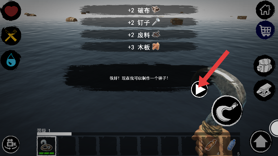 1、在生存模式下,用钩子收集木板、破布等物资,合成锤子等工具,扩建木筏、提升生存等级,积累基础游戏进度。