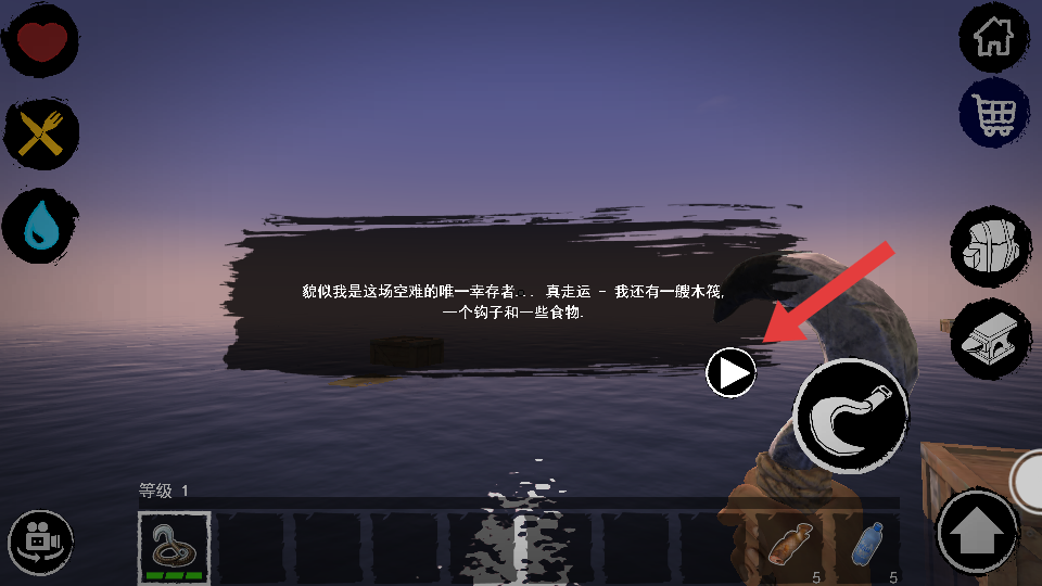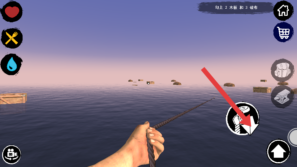 1、点击右侧钩子按钮,瞄准海上漂浮物、木箱、残骸抛出钩子,勾取木板、破布等基础物资,用于建造或制作。