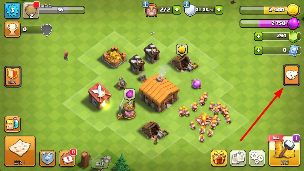 1、进入部落冲突游戏主界面,点击屏幕右侧带有手掌图标的社交按钮,进入社交相关操作界面。