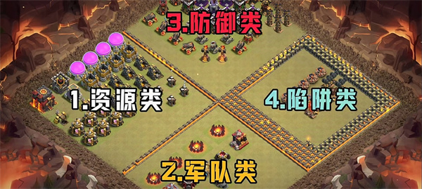 分别是资源类、军队类、防御类和陷阱类,这四种建筑的升级顺序就是,优先军队类,其次防御类,再然后是陷阱类,最后是资源类。