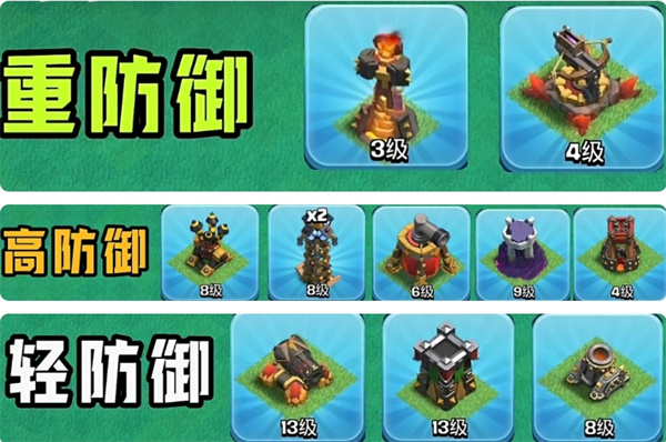 防御类建筑按照重高轻三个级别来升级,优先升级地狱塔,十字连弩这类重防御,然后升级防空火箭、电塔、吹风机、法师塔、炸弹塔这些高防御建筑,最后升级加农炮、箭塔、迫击炮这三个熟悉的轻防御建筑,陷阱类的话能升级就尽量升到当前大本营的等级。