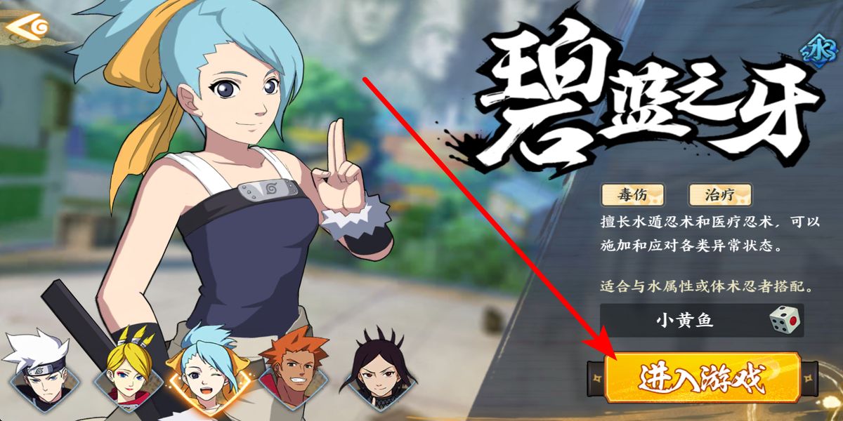 1、在角色界面选碧蓝之牙,该角色擅长水遁忍术与医疗忍术,可施加和应对异常状态,适配水属性或体术忍者搭配,确认后点击进入游戏开启冒险。