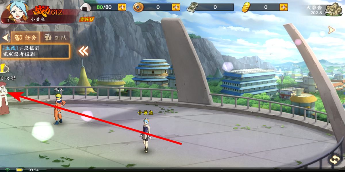 2、主线任务接取进入主城火影岩场景,找到火影NPC与之对话,接取到主线任务下忍报到训练任务,跟随任务指引逐步推进剧情,解锁后续玩法与功能。