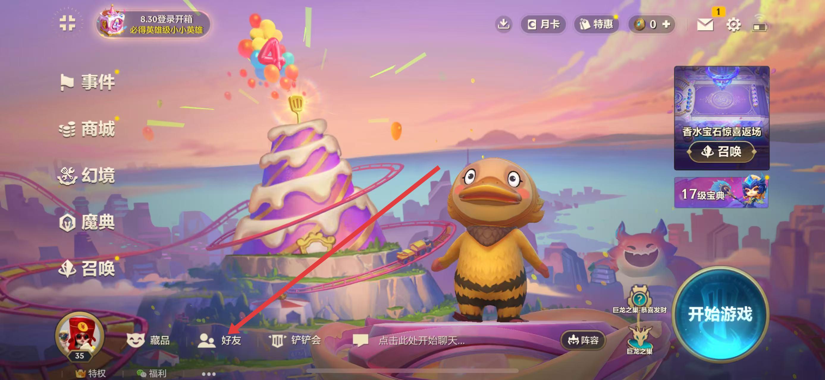 1、打开金铲铲之战游戏,进入主界面,点击下方菜单栏中的好友选项,进入社交界面。