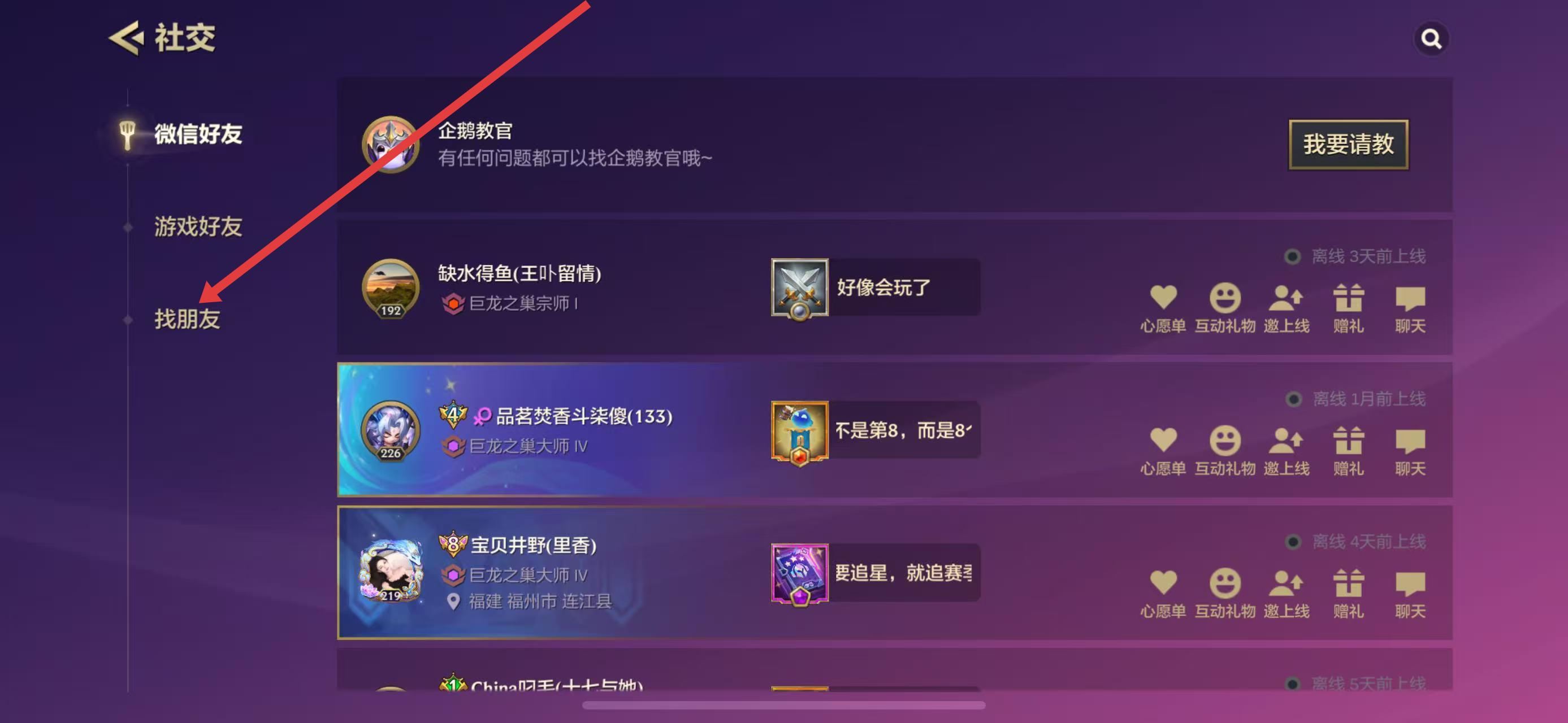 2、在社交界面,点击左侧列表中的找朋友,切换到寻找好友的页面。