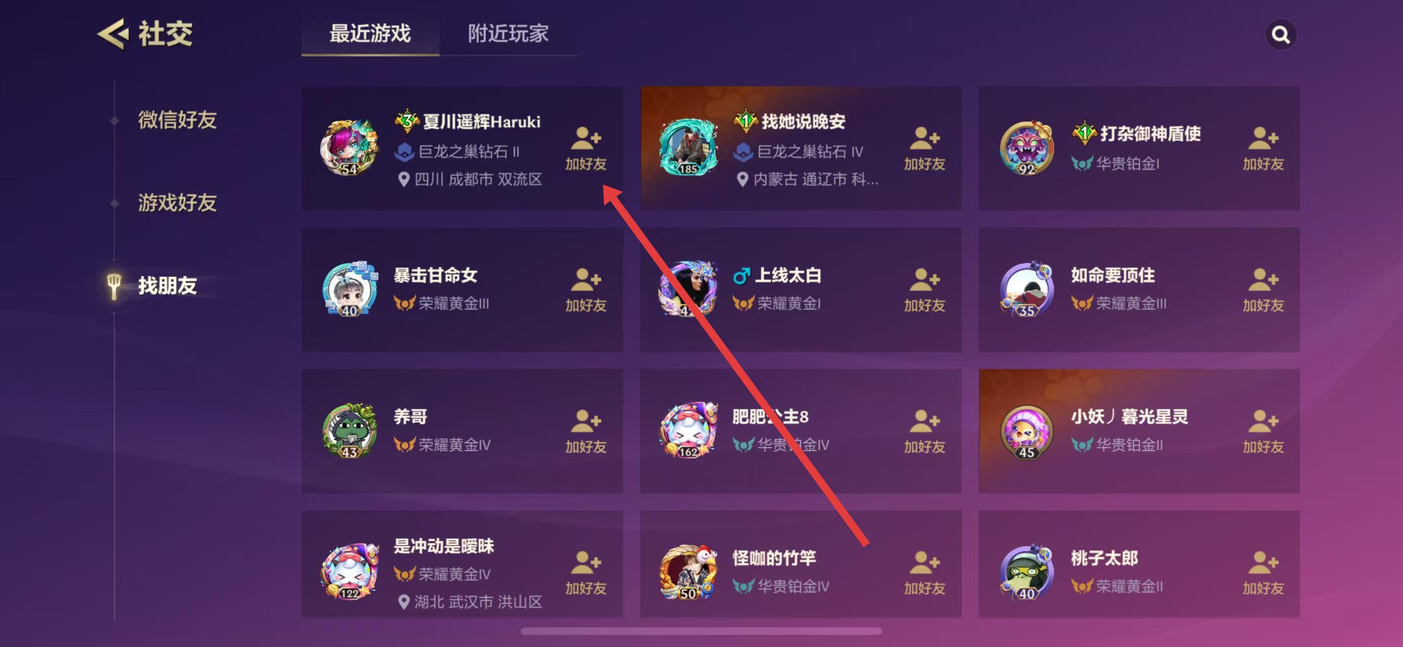 3、在找朋友页面,会显示最近游戏的玩家或附近玩家,找到想添加的好友,点击其头像旁的加好友按钮,等待对方通过即可。