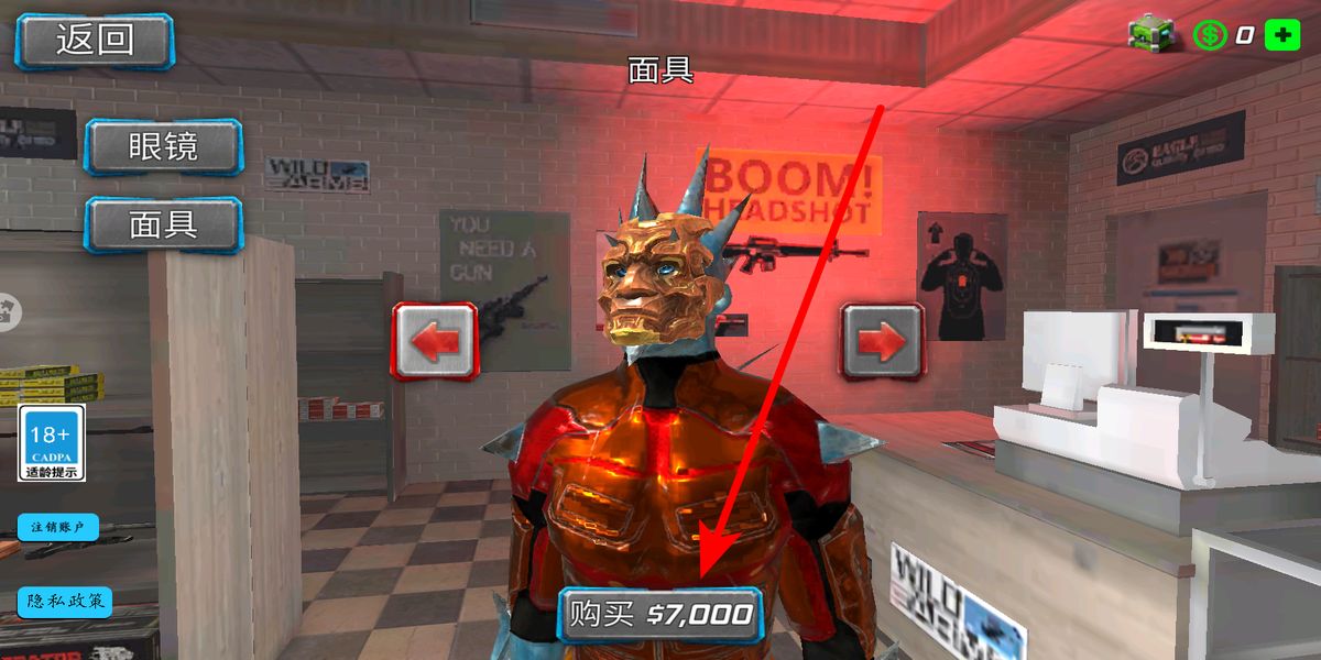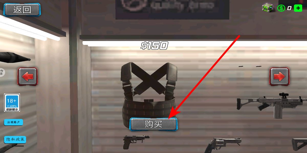 2、武器采购步骤进入武器界面,浏览枪械背带等道具,选中目标物品后点击购买按钮,消耗货币获取装备,提升角色战斗时的续航或攻击能力。