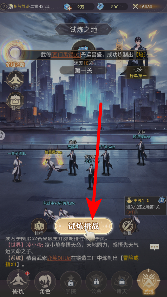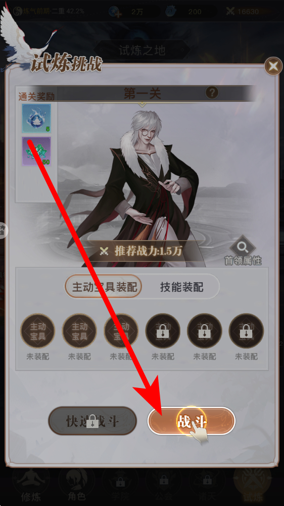 1、进入试炼的界面,点击中央试炼挑战按钮,选定目标关卡如界面显示的第一关,查看推荐战力与首领属性,完成战前的筹备。