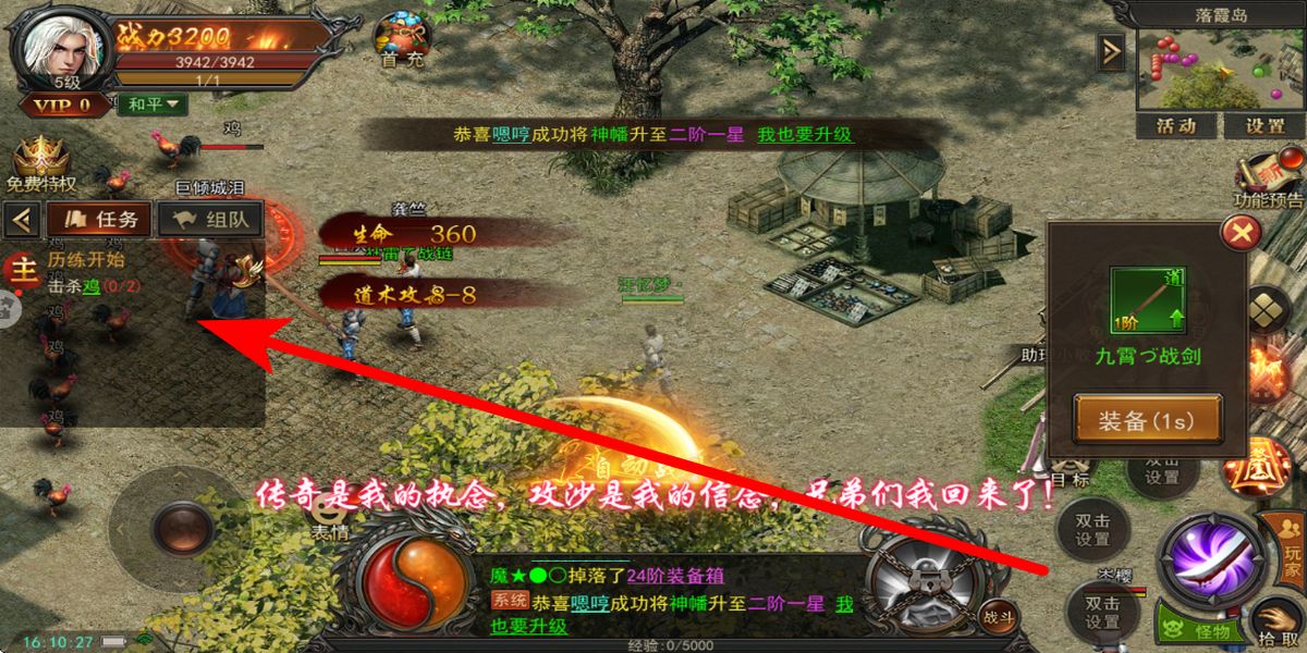 1、接取初始任务历练开始,前往落霞岛击杀鸡怪,开启自动战斗功能可高效完成,任务奖励基础装备与资源,助力前期属性提升。