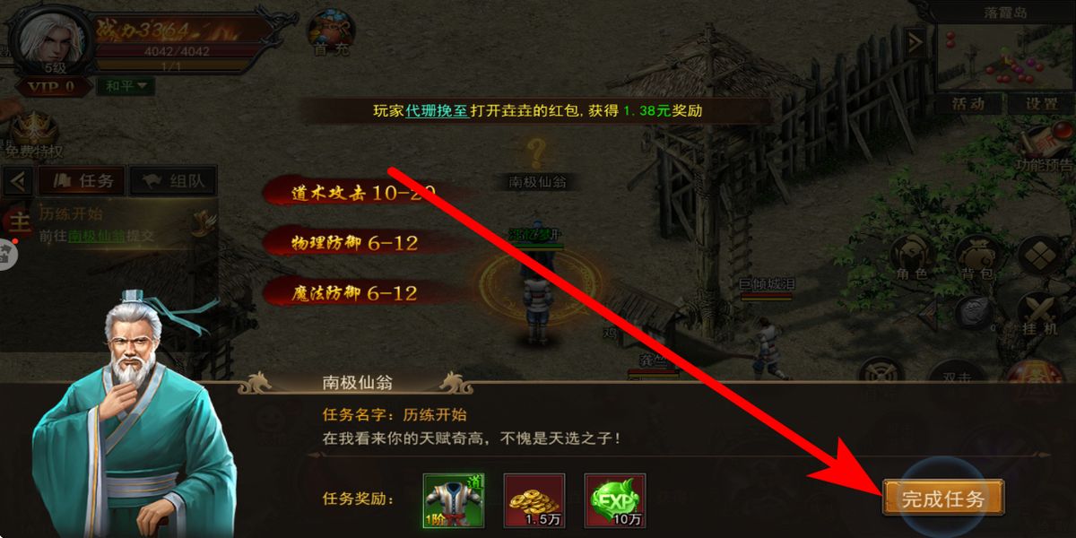 2、完成鸡怪击杀后,与南极仙翁对话提交任务,获取经验金币与新装备,解锁后续初面魔物任务,逐步推进角色成长线。