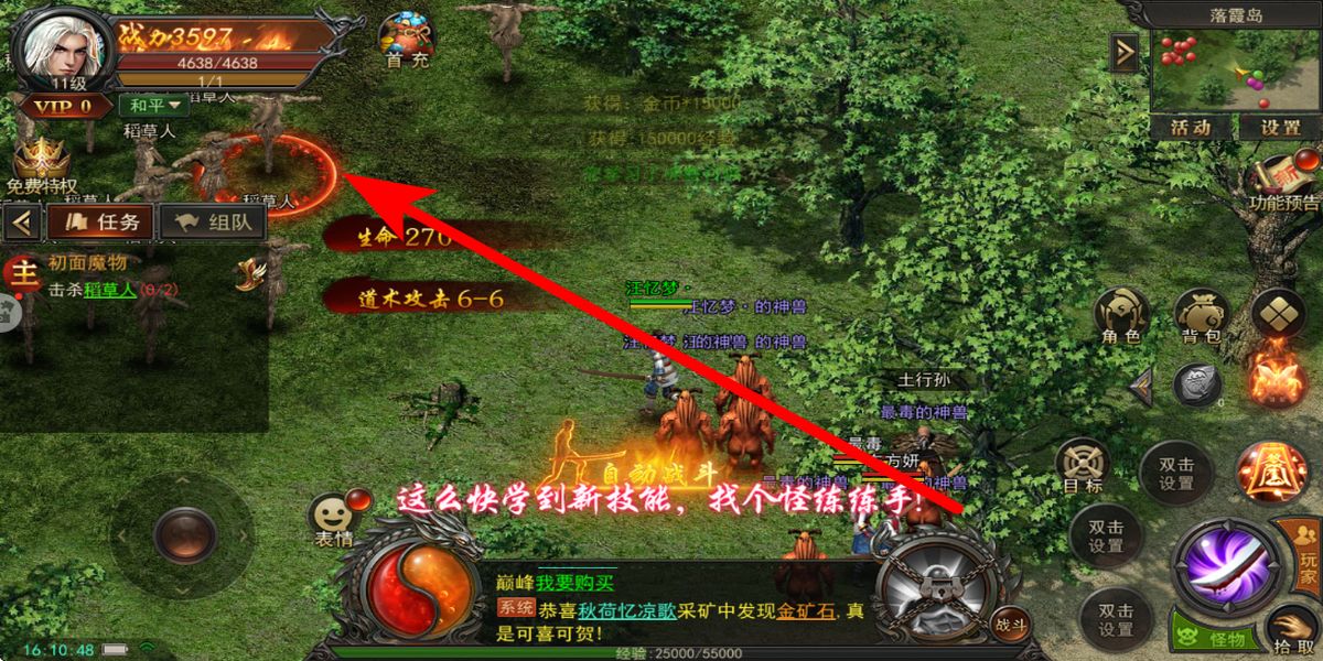 3、承接初面魔物任务,前往指定区域击杀稻草人,实践新习得技能,借助自动战斗持续积累经验,解锁更高级玩法与地图。