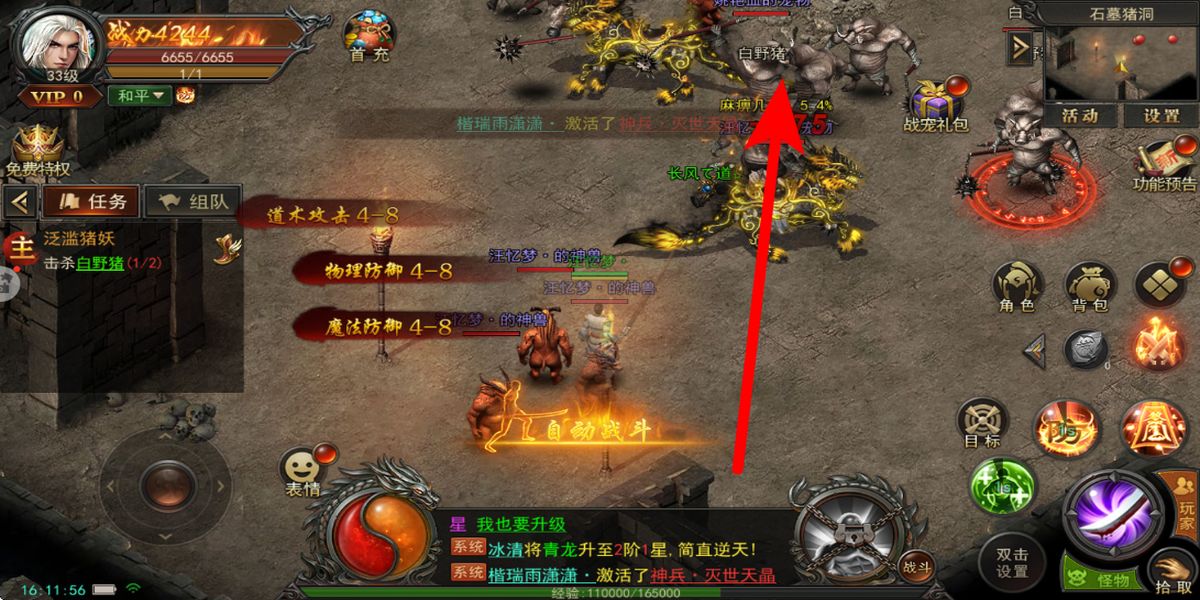 2、优先接取泛滥猪妖等任务,自动战斗模式下,战宠与角色配合击杀白野猪等怪物,注意拾取掉落的防御装备,积累物理与魔法防御属性,提升生存能力。