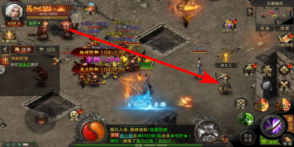 3、清剿怪物后,自动寻路找到侯太乙提交任务,获取经验与资源奖励,利用奖励强化装备或提升战宠等级,逐步解锁转生、图鉴等核心系统,夯实成长基础。