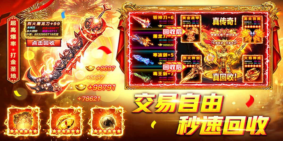 1、装备保值回收:所有装备均可通过元宝回收系统变现,神装爆率高达千倍,支持越级挑战BOSS,35级小号也能轻松获取高阶装备,不氪不肝的打金体验。