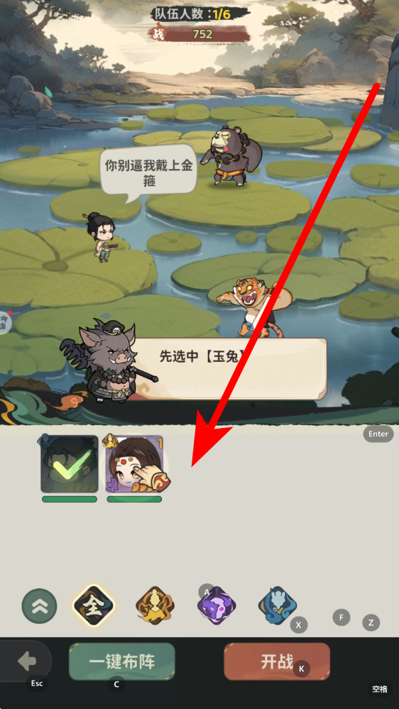 1、选将阶段界面下方展示可选角色,依据提示选中指定角色如玉兔,点击角色头像完成选择,逐步扩充队伍人数,提升整体战力。
