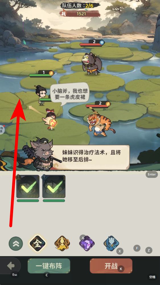 2、布阵调整选中角色后,可拖动至合理位置如治疗角色移至后排,也可借助一键布阵功能优化站位,根据角色职能规划攻防阵型。