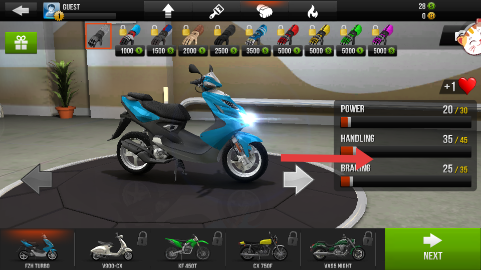 2、升级摩托POWER、HANDLING等属性,可消耗游戏内金币逐步提升,可付费购买金币礼包,加速摩托性能养成。