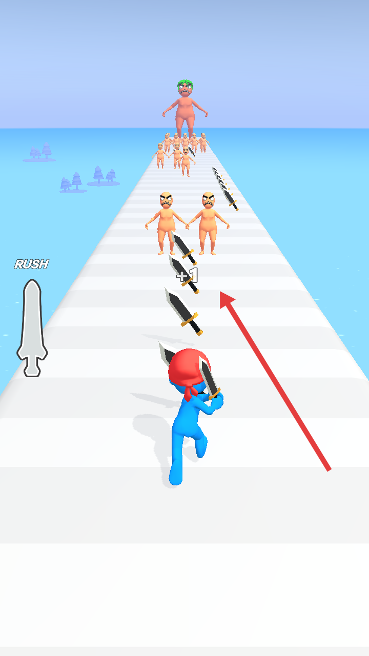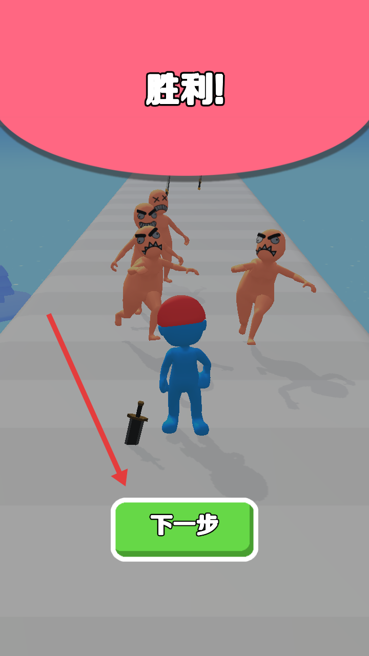 1、操控蓝色小人沿跑道前进,拾取路上刀剑,增加武器数量,遇到敌人自动攻击。